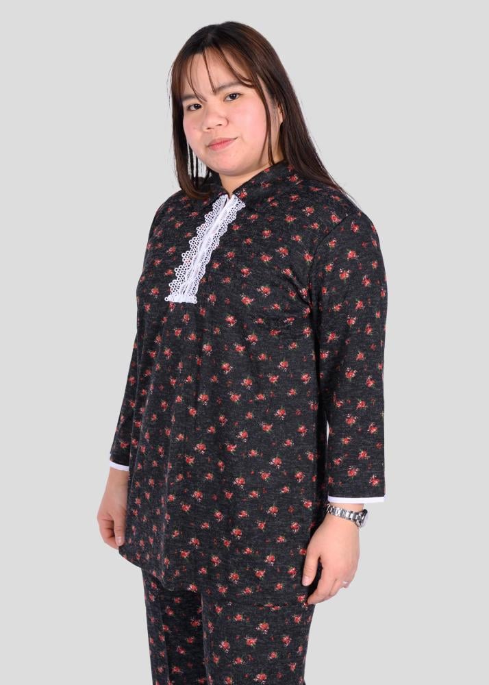 زي عاملات شتوي نسائي دافئ ومطبوع بنقشة زهور صغيرة على خلفية داكنة، يتميز ببلوزة طويلة بياقة قميص صغيرة وفتحة صدرية مزينة بدانتيل أبيض بارز، وبنطال بقَصَّة مريحة بنفس النقشة. مثالي للدفء والعملية بمظهر أنثوي.