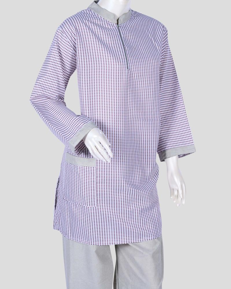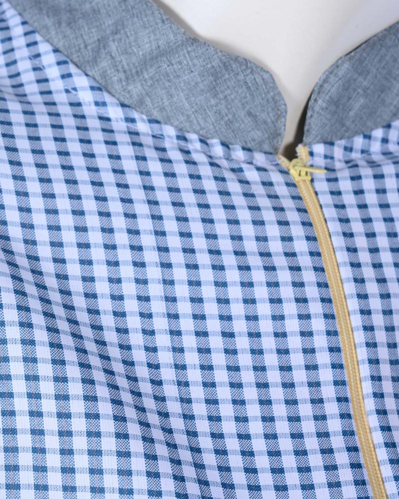 زي عملي وأنيق مخصص للعاملات المنزلية، بتصميم مريح ومناسب للمقاسات الكبيرة. يتكون من قميص طويل بنقشة كارو كلاسيكية بألوان هادئة مع ياقة دائرية وسحاب أمامي لسهولة اللبس، وتفاصيل بلون أزرق فاتح على الأكمام والجيوب لإضافة لمسة أنثوية بسيطة.
