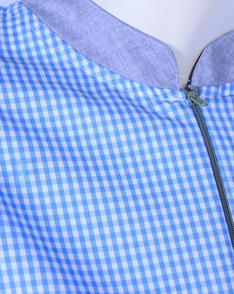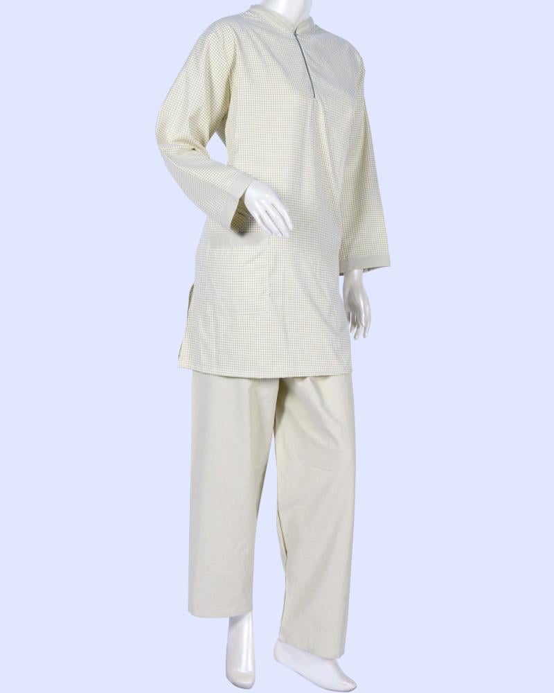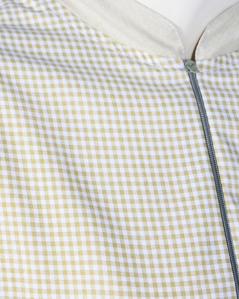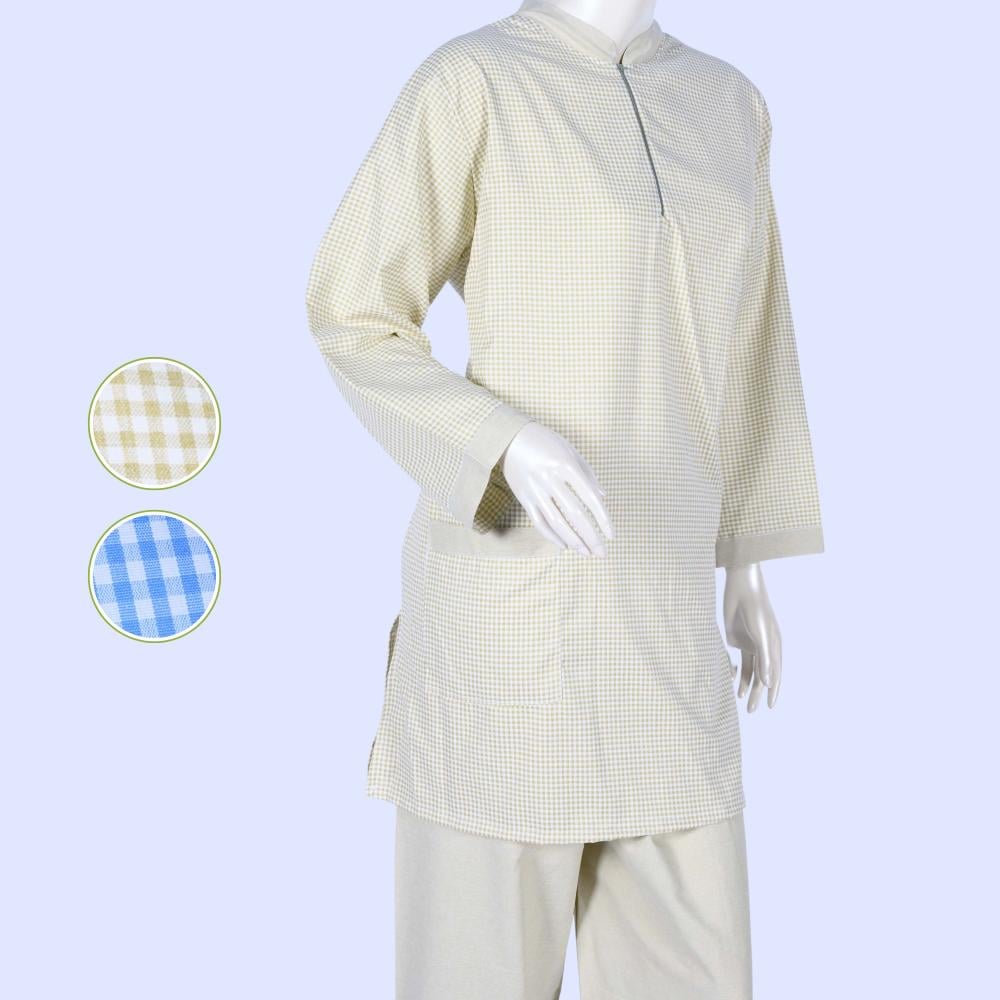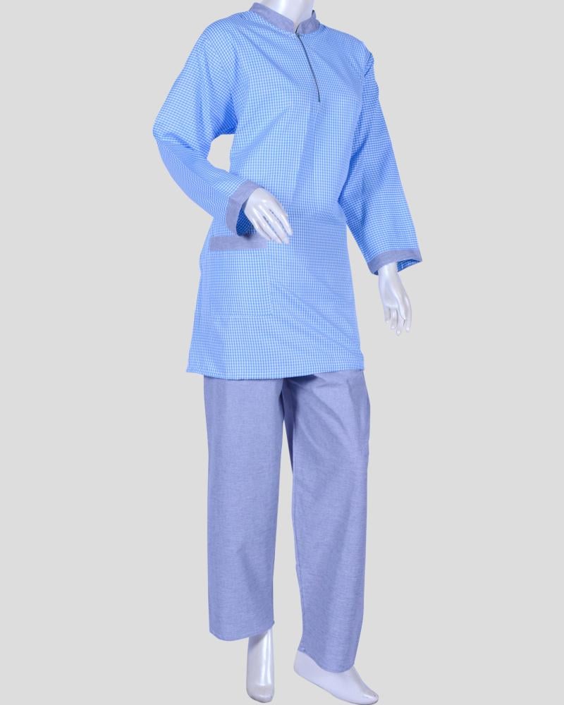 زي عملي وأنيق مخصص للعاملات المنزلية، بتصميم مريح ومناسب للمقاسات الكبيرة. يتكون من قميص طويل بنقشة كارو كلاسيكية بألوان هادئة مع ياقة دائرية وسحاب أمامي لسهولة اللبس، وتفاصيل بلون أزرق فاتح على الأكمام والجيوب لإضافة لمسة أنثوية بسيطة.