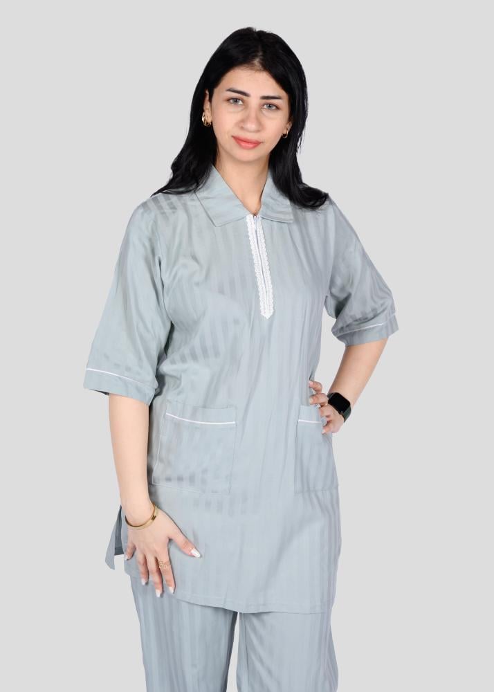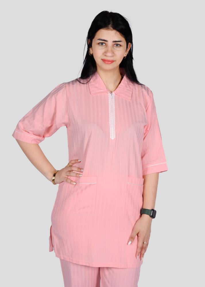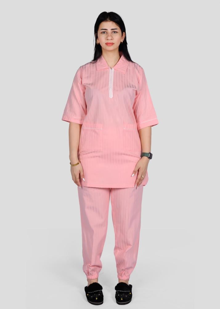 زي عمل نسائي عملي بتصميم مريح واحترافي يناسب بيئات العمل المختلفة مثل الصالونات والمراكز الطبية والمطاعم.
