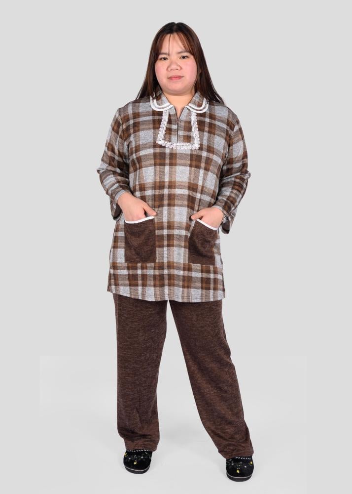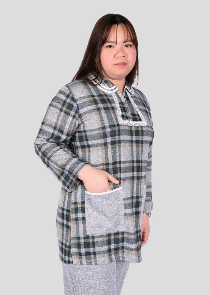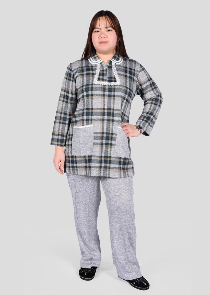 طقم زي عاملات شتوي بتصميم كاروهات دافئ ومريح، يتميز ببلوزة طويلة ذات ياقة مزينة بدانتيل وجيوب أمامية واسعة، وبنطال بلون سادة متناسق. مثالية للراحة والأناقة في ليالي الشتاء الباردة.