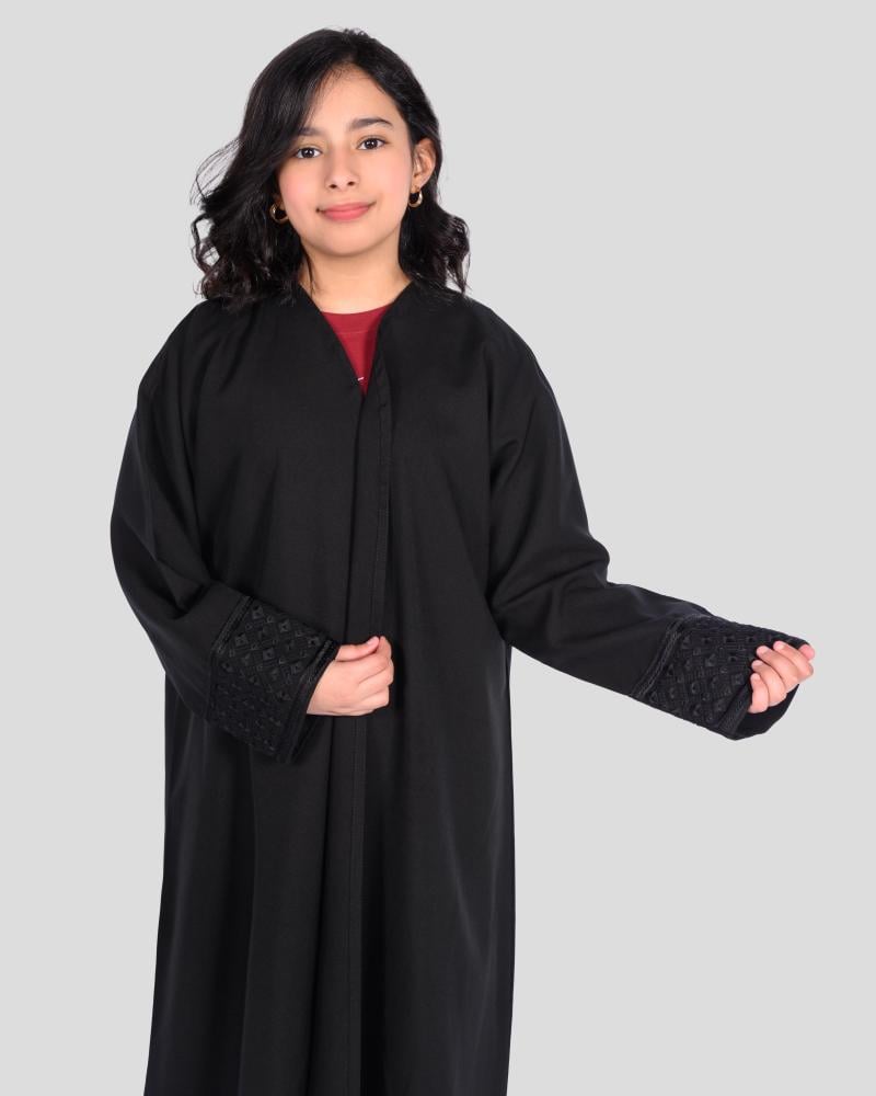 عباية بناتي فاخرة باللون الأسود الكلاسيكي، مصنوعة من قماش ناعم وخفيف، بتصميم واسع وانسيابي لحرية أكبر في الحركة. مزدانة بنقشات أنيقة تضيف لمسة جمالية مبهجة، لتجمع بين الحشمة والأسلوب العصري، مثالية للمناسبات العائلية والخروج اليومي