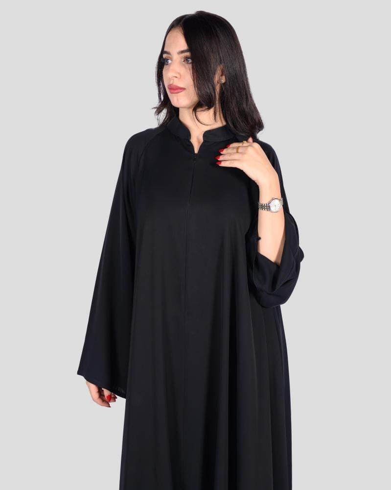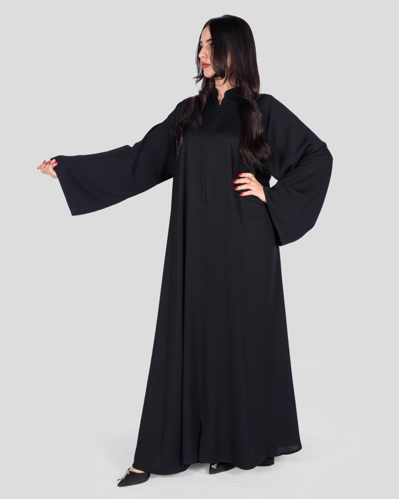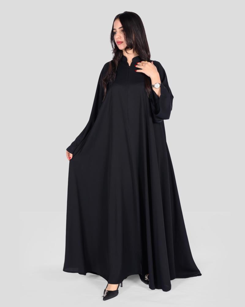 عباية نسائية باللون الأسود بتصميم فضفاض وانسيابي يوفر حرية حركة ويعزز المظهر المحتشم. مزودة بياقة قصيرة، مع أكمام طويلة منسدلة تمنح راحة وأناقة خلال اللبس. طول العباية يغطي الجسم بالكامل حتى الكاحلين.
