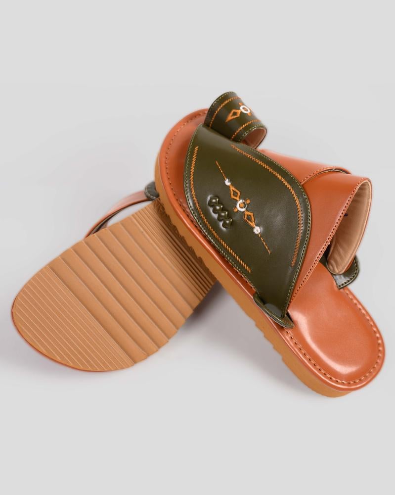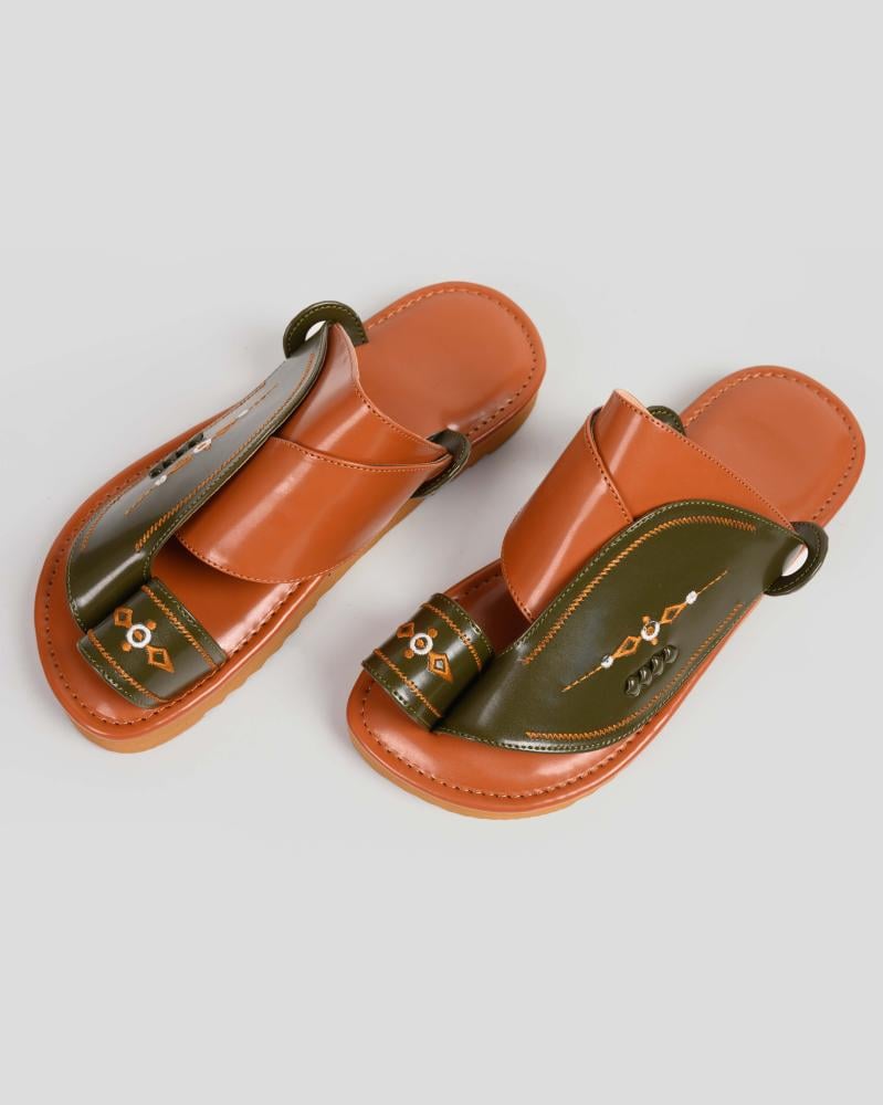 النعال مصنوع بدقة من خامات مختارة بعناية، مع خياطة زخرفية بارزة تعكس الطابع الشرقي الأصيل. الأشرطة العريضة تغطي الجزء العلوي من القدم لتمنح ثباتًا وأناقة، بينما يمنح النعل المرن دعماً إضافياً للقدم أثناء الحركة.
