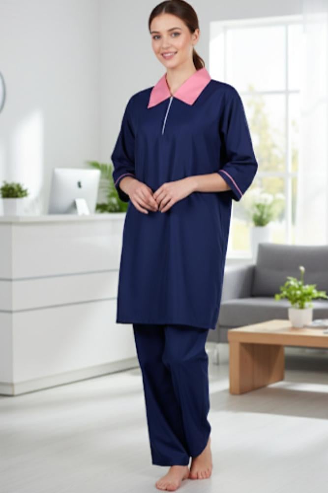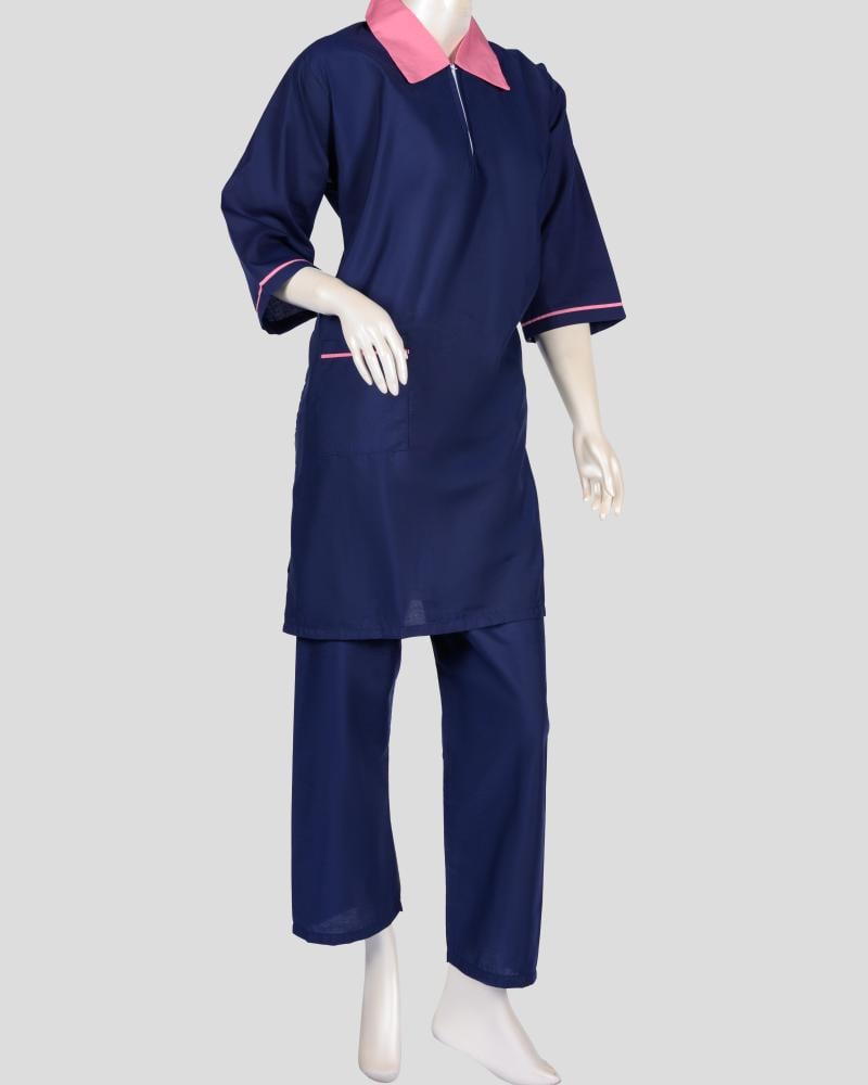 طقم عمل موحد مصمم ليلبي احتياجاتك اليومية. يتميز هذا الطقم بتصميمه المبتكر الذي يجمع بين اللون الكحلي الغامق واللون الوردي الفاتح، مما يضفي عليه مظهرًا عصريًا وجذابًا. تم تصميمه بقصة مريحة وواسعة لضمان حرية الحركة، مما يجعله مثاليًا للوظائف التي تتطلب الكثير من الحركة مثل الرعاية الصحية، الضيافة، أو الخدمات المنزلية.