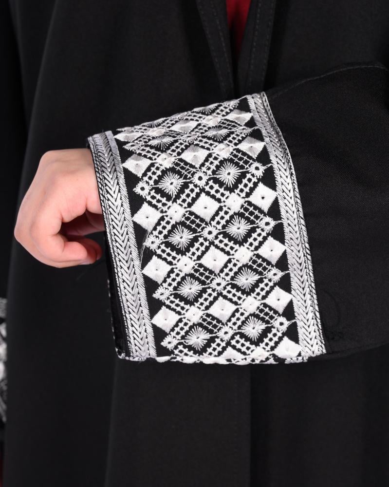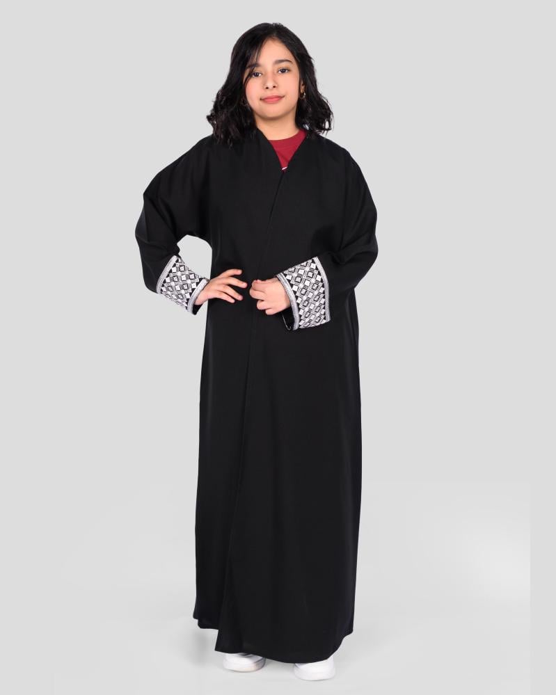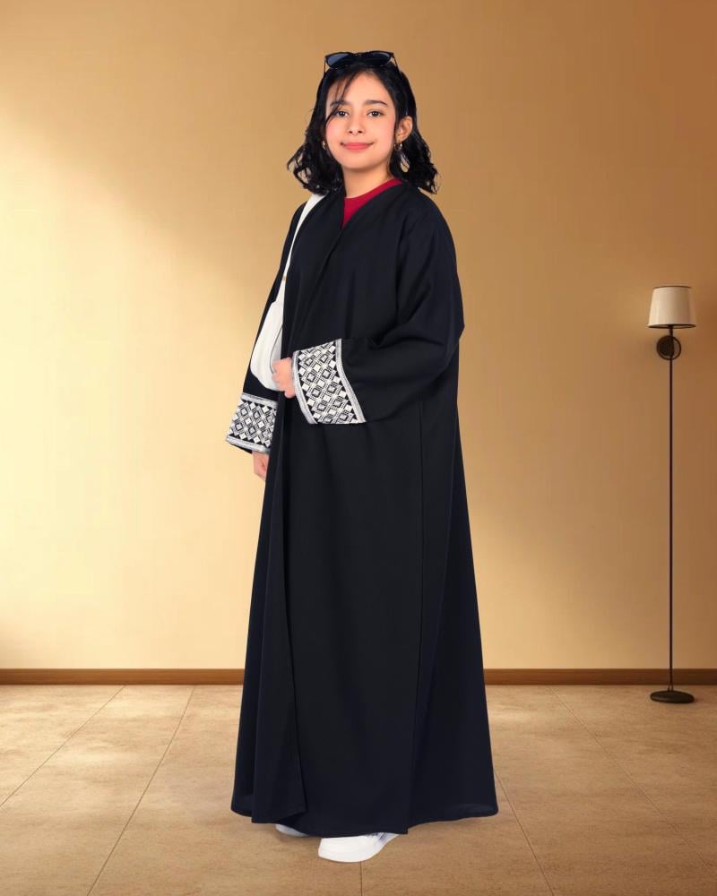 عباية بناتي فاخرة باللون الأسود الكلاسيكي، مصنوعة من قماش ناعم وخفيف، بتصميم واسع وانسيابي لحرية أكبر في الحركة. مزدانة بنقشات أنيقة تضيف لمسة جمالية مبهجة، لتجمع بين الحشمة والأسلوب العصري، مثالية للمناسبات العائلية والخروج اليومي